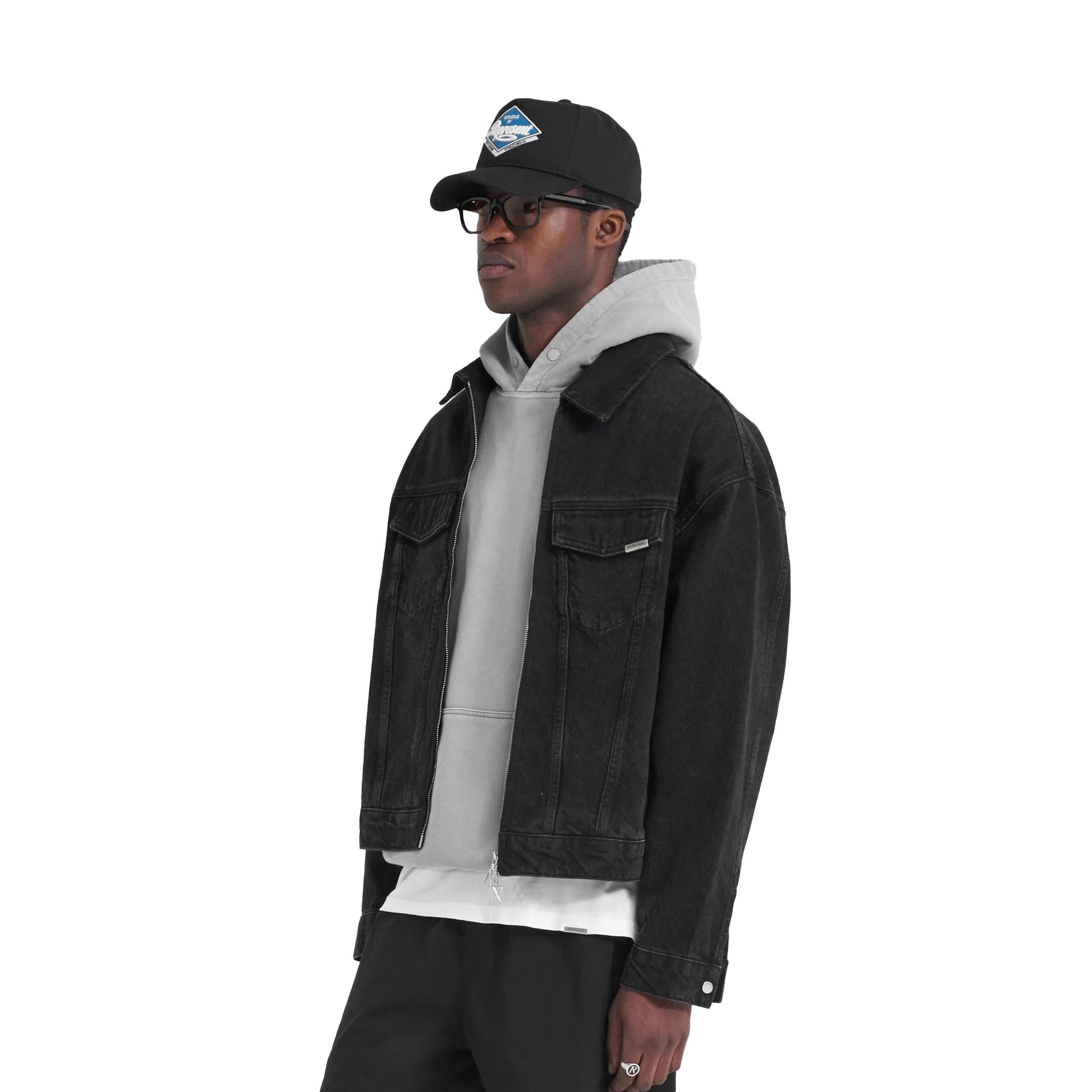 Introducing the R4 Denim Jacket in Black, a slightly oversized silhouette, with a heavy wash. It has a kissing welt to the double ended antique silver RiRi branded zip closure, and V detailed yoke to the back. The jacket has side entry welt pockets and chest pockets with popper fastenings. Cobrax popper adjusters are to each side at the hem and cuff and the jacket is finished with a Represent metal bar to the chest pocket.
